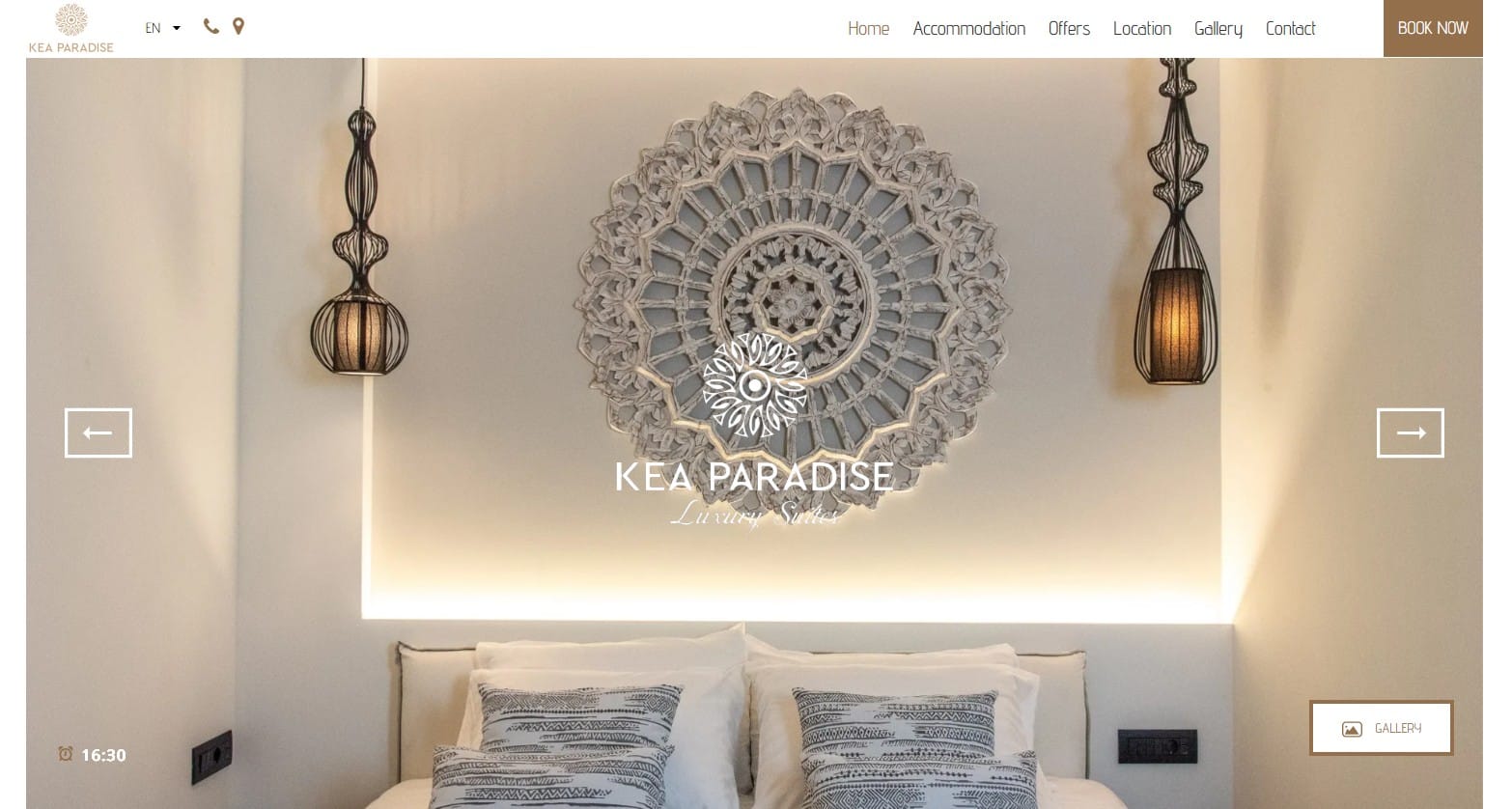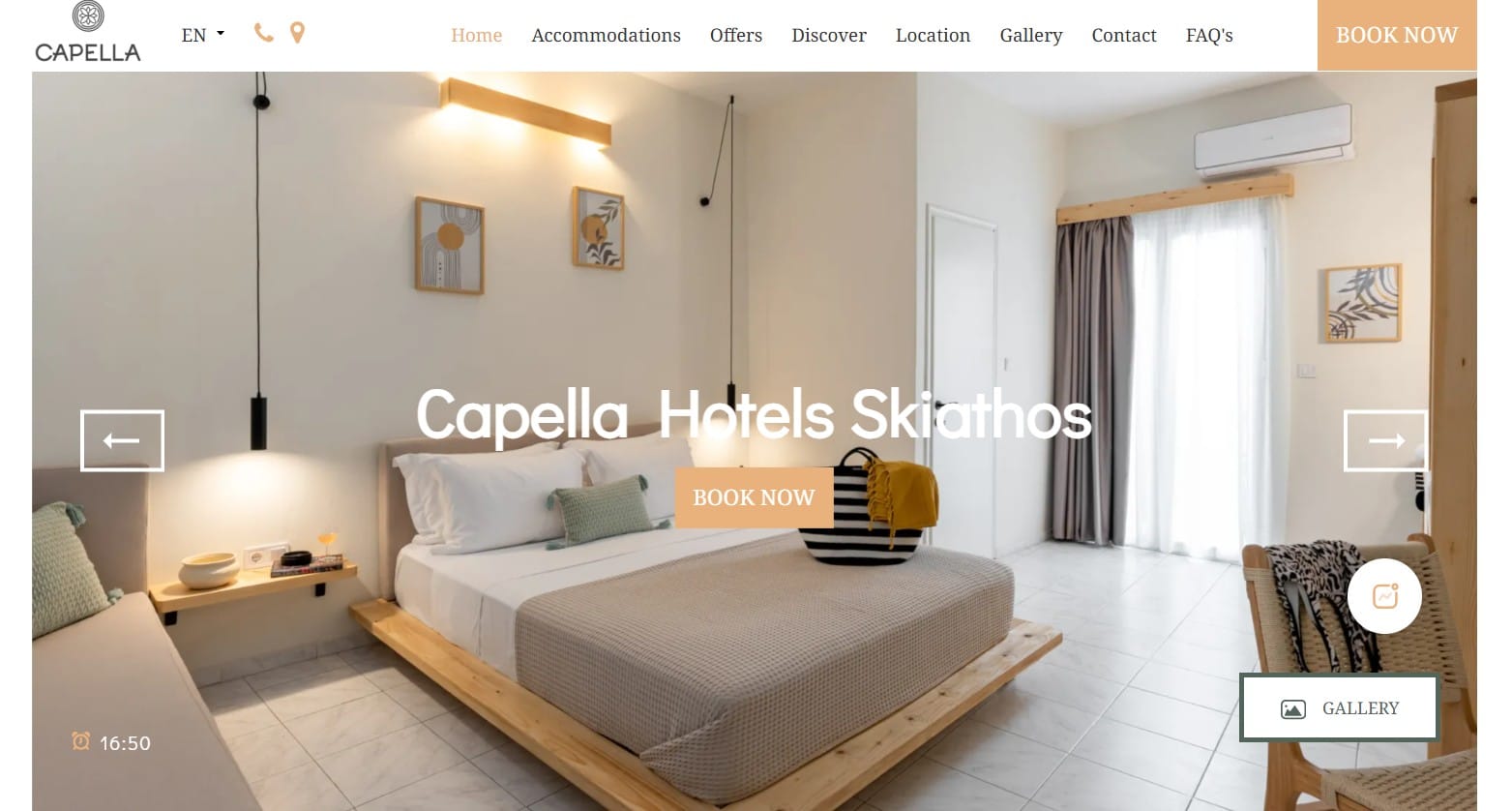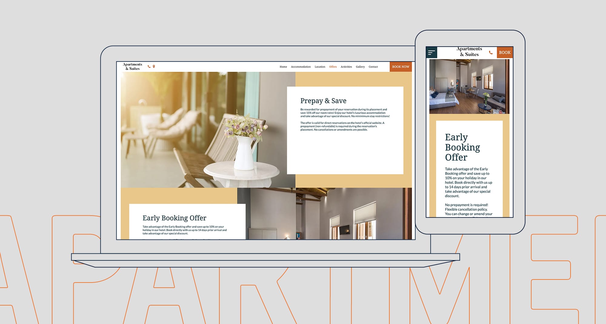Using simple design elements, the Apartments & Suites Canvas focuses on the clear presentation of the property and its services, as well as on providing comprehensive information about the property's location and the experiences that the guests will enjoy.