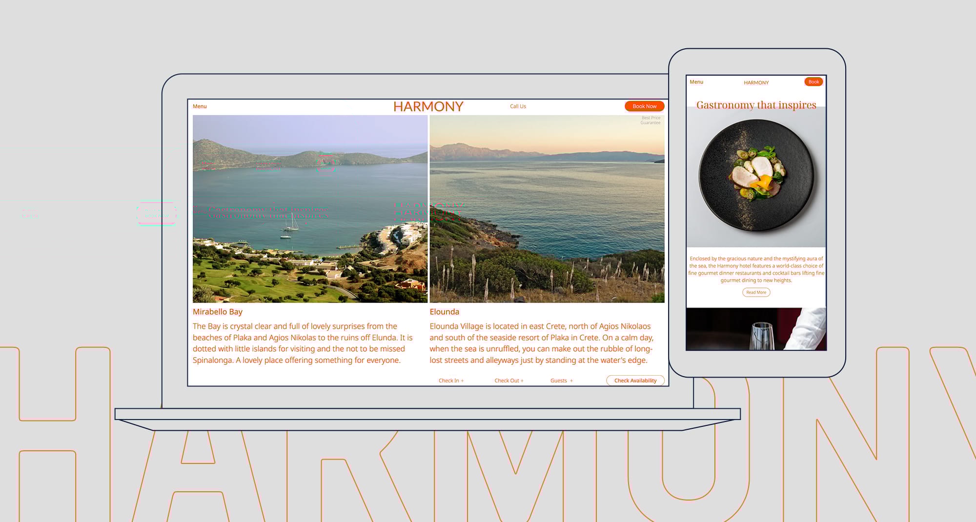 The Harmony Canvas, designed by MNP, veers away from mainstream hotel website design templates and instead employs an extraordinary design that highlights the hotel's images and the aura of the property.