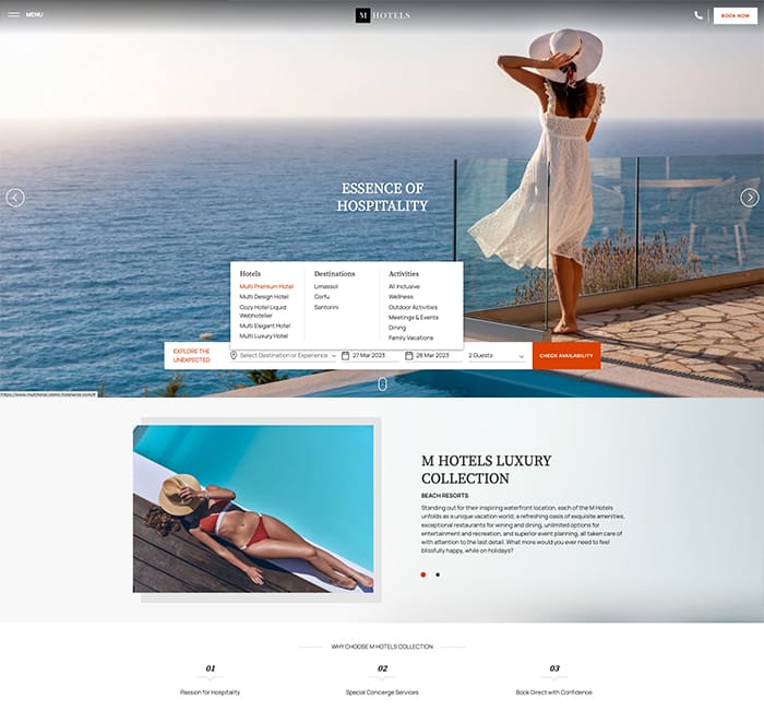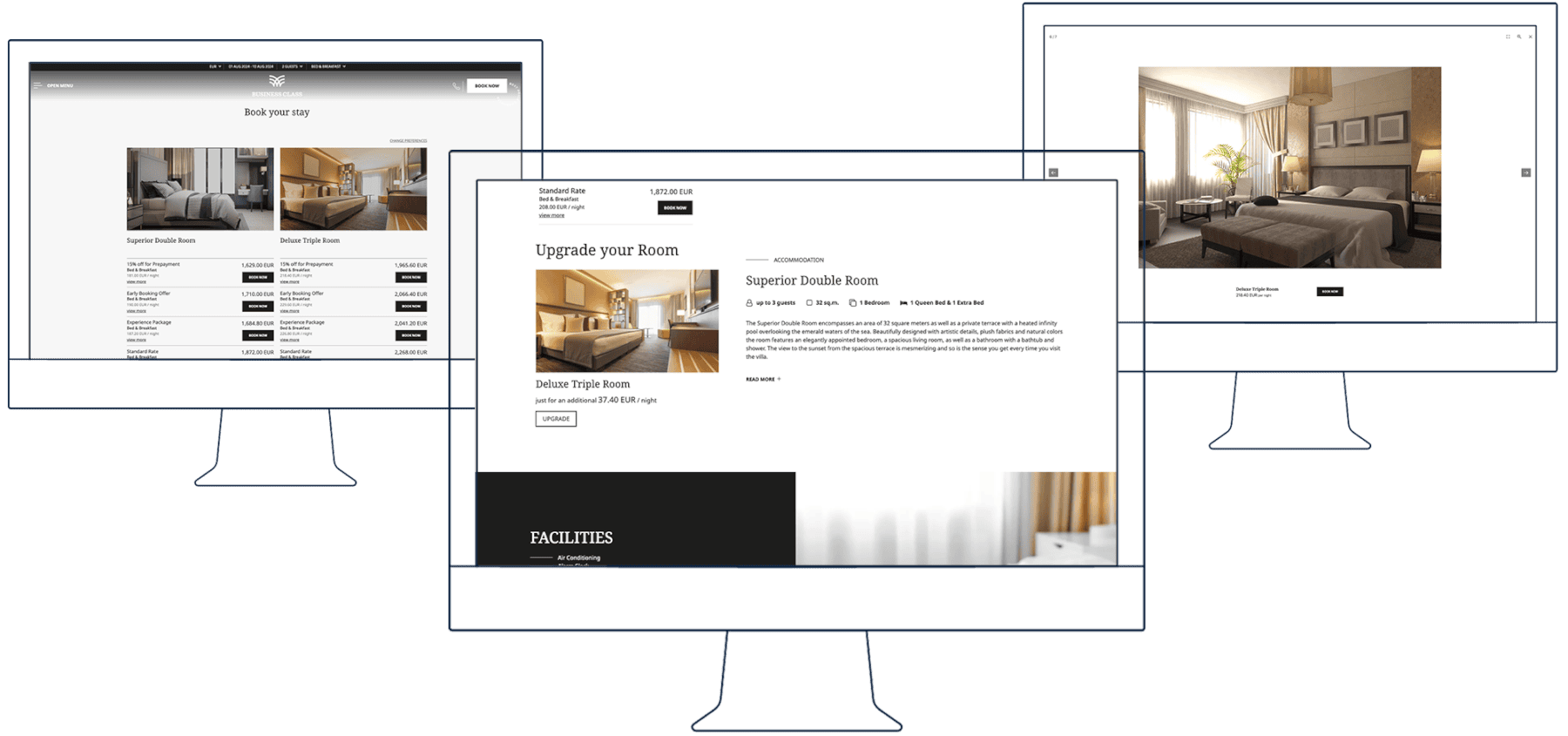 Through its Liquid e-Commerce functionality, Hotelwize integrates seamlessly the whole booking flow into the hotel website. The booking engine becomes part of the website experience, increasing the visitors' trust to the booking procedure and boosting the direct reservations. Though multiple functions Liquid e-Commerce succeeds to enhance significantly the conversion rate of the hotel's website.